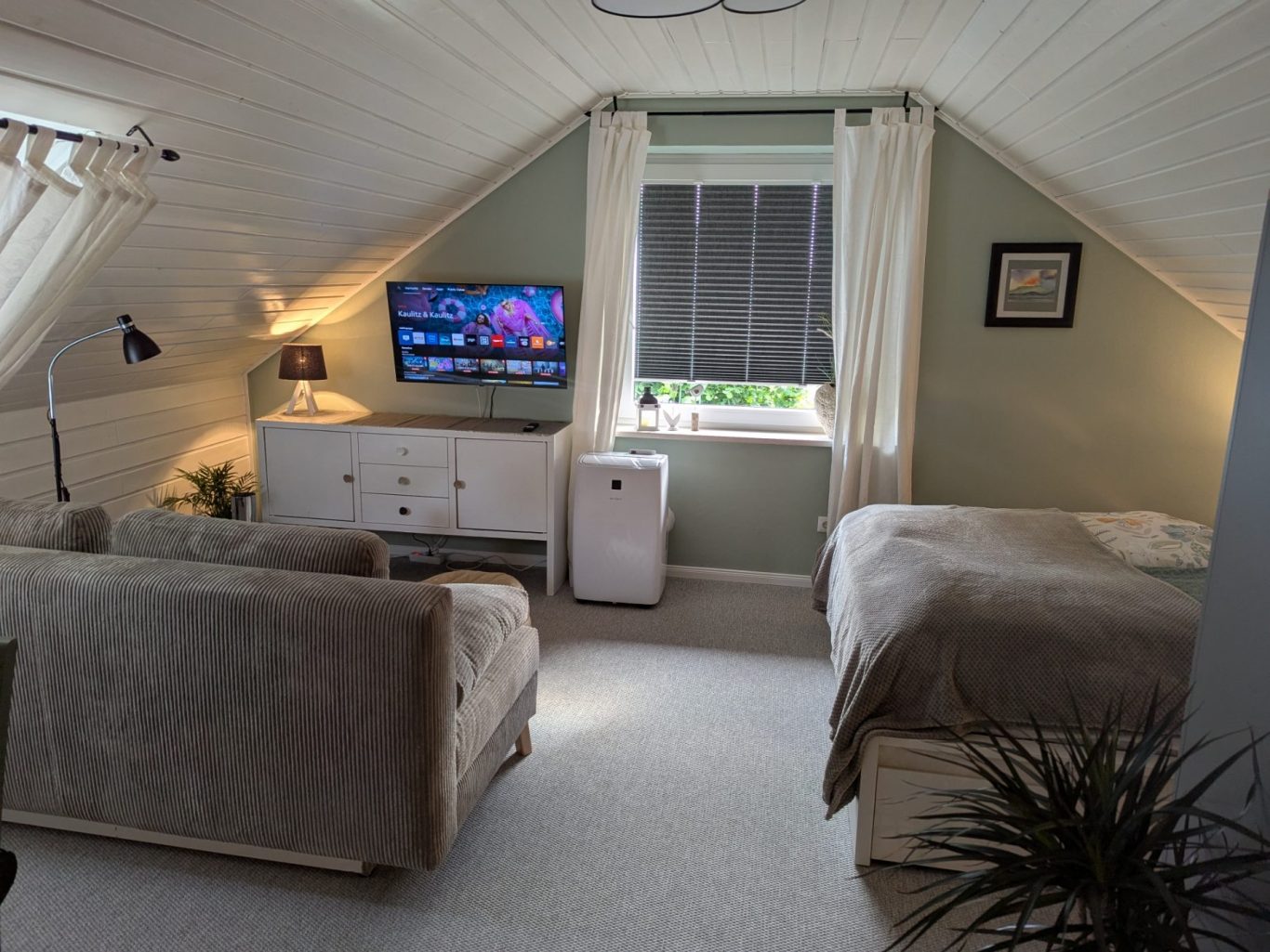 Hier können Sie sich nach einem Langen Tag, in einem klimatisierten Zimmer ausruhen und Fernsehen in HD+. WLAN können Sie kostenlos nutzen. Der Fußboden ist mit einem speziellen Teppich ausgelegt, der sehr angenehm und wohlfühl Charakter hat.