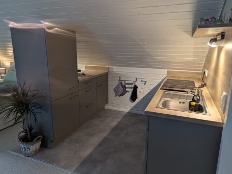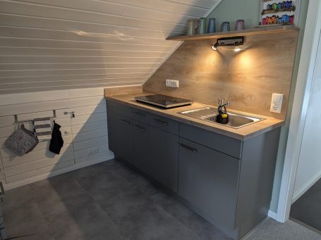Die Küche ist voll ausgestattet z.B. mit einer Doppel-Induktionskochplatte sowie einer Ninja Heißluftfritteuse, Kaffeemaschine, Mikrowelle mit vielen Funktionen. Geschirrspüler, Kühlschrank mit Eisfach und weiteren Geräten.